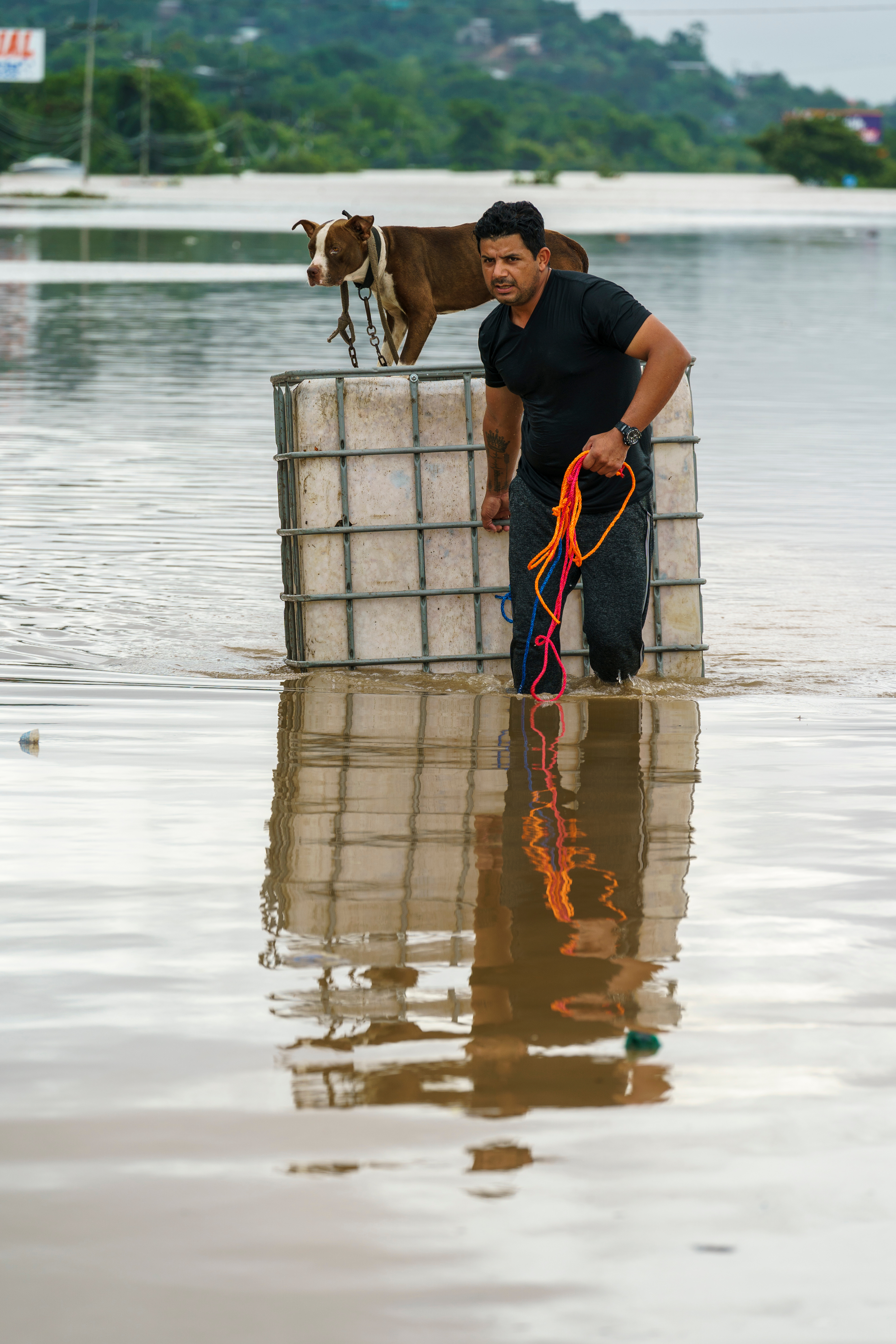 Elio Gomez stands on the breached levee (background) in La Lima, Honduras, assessing the flooded town following Hurricane Iota.